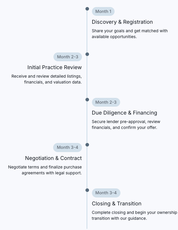Purchasing a dental practice is an exciting milestone — but it’s also a complex process that requires strategic guidance. At Chicago Dental Brokers, we make your path to ownership clear, structured, and stress-free.